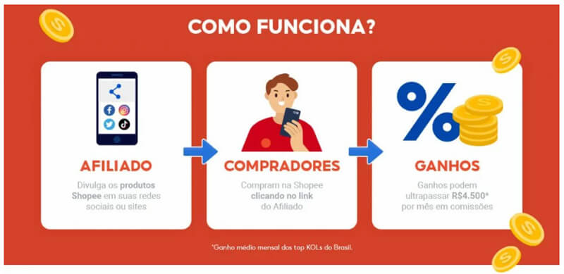 E quando falamos de acessibilidade e praticidade, o programa da Shopee se destaca com uma estrutura simples, comissões por venda e várias formas de divulgação, ideal para quem está começando do zero.