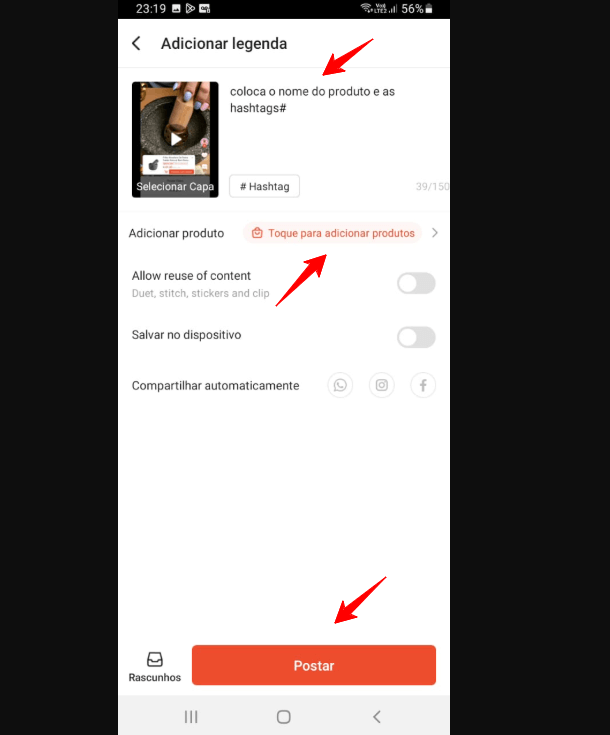 6. Coloque legenda e hashtags