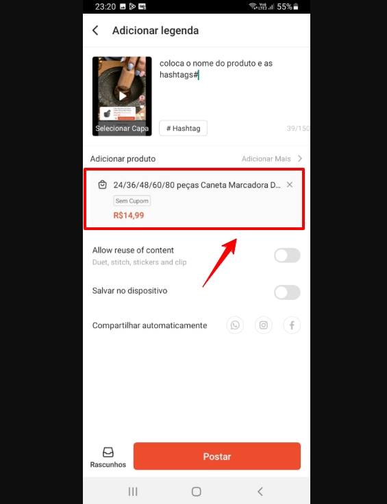 Coloque uma legenda chamativa e hashtags relevantes (#ShopeeAchados, #OfertasShopee, #ShopeeBrasil).